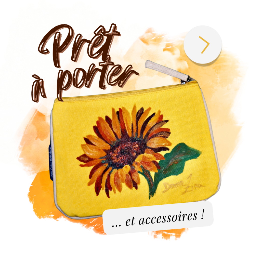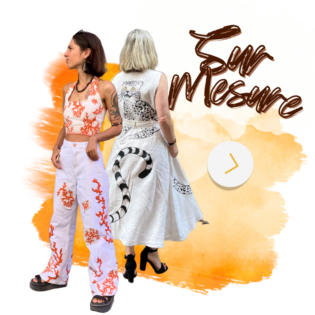 Tantôt tots bags et trousses en coton bio, tantôt chemises issues de seconde main peintes à la main, tantôt jeans, vestes ou robes vintages transformés en œuvres d’arts, l’artiste fabriquera ou redonnera une nouvelle vie à un vêtement personnalisé.